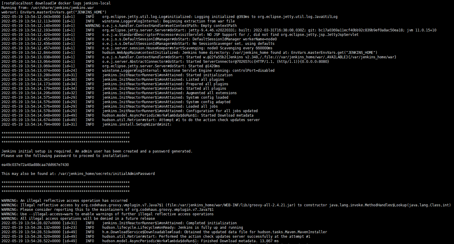 首次启动时,需要输入初始化密码,可以在Jenkins启动日志中查看,或是从文件中获取: